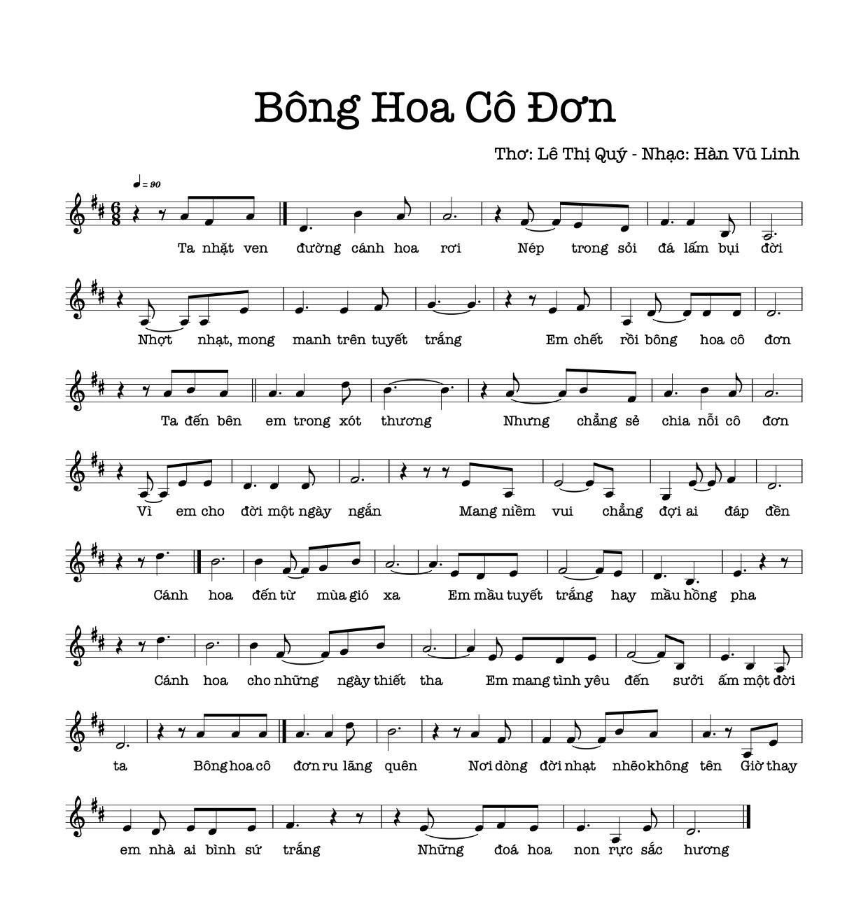 | Bông hoa cô đơn Sáng tác: Hàn Vũ Linh, 2021 Thơ: Lê Thị Quý Phối khí: Yên Lam Ca sĩ thể hiện: Nguyễn Duyên Quỳnh Công bố: Hàn Vũ Linh Album 4 Cài nắng vào tóc em 2022 |