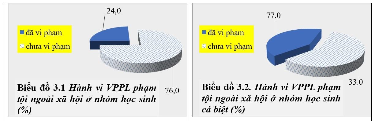 Về các hành vi vi phạm và phạm tội cụ thể, theo bảng 3.1 thì tỷ lệ cả 2 nhóm học sinh và học sinh cá biệt không cao nếu áp vào từng tội danh vi phạm, hoặc phạm tội. Nói cách khác là mặc dù tỷ lệ từng vi phạm 01 tội khá cao, nhưng lại được phân tán nhỏ trên 21 tội danh. Nhiều em vi phạm hoặc phạm tội này thì lại không vi phạm và phạm tội khác. Đối với nhóm học sinh, tỷ lệ vi phạm cao nhất là tội “chửi bới, xúc phạm người khác trên mạng” (8,8%). Còn với 20 hành vi vi phạm và phạm tội đều chỉ có dưới 5% các em phạm phải.Đối với nhóm học sinh cá biệt, tỷ lệ vi phạm cao nhất là “vi phạm luật giao thông” (15,9%) và tội “chửi bới, xúc phạm người khác trên mạng” (8,8%). Còn với 20 hành vi vi phạm và phạm tội đều chỉ có dưới 5% các em đã từng phạm phải.
