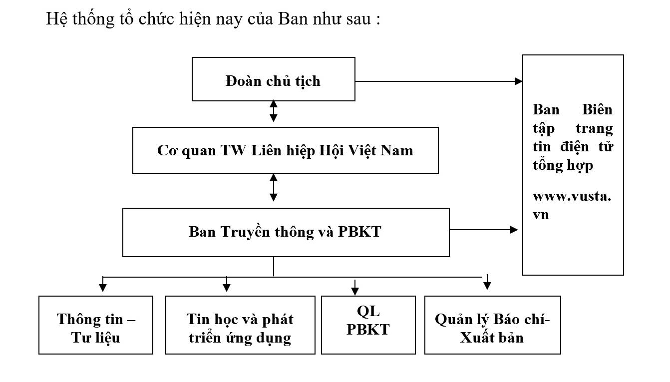 – Phổ biến, hướng dẫn các văn bản của Đảng, Nhà nước và Liên hiệp Hội Việt Nam liên quan đến hoạt động truyền thông, phổ biến kiến thức khoa học và công nghệ cho các hội thành viên, các tổ chức trực thuộc.
